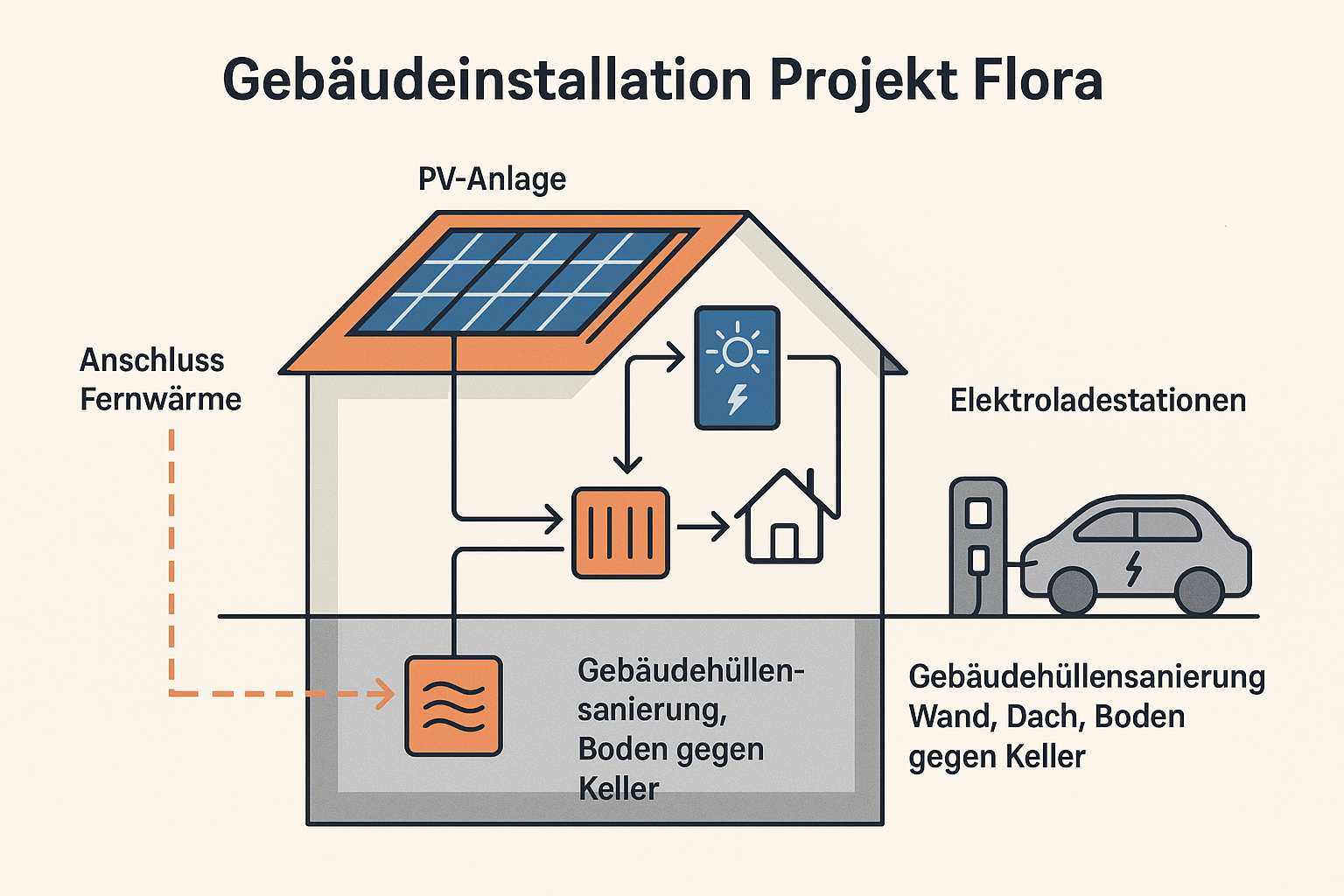 - Sanierung der Gebäudehülle, inklusive Dach, Fassade und Kellerdecke, zur Minimierung des Energieverlusts.