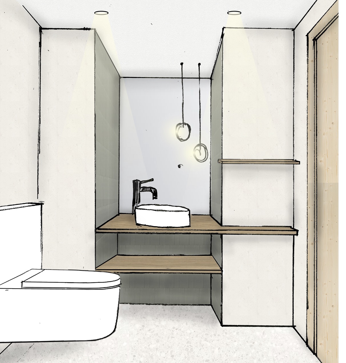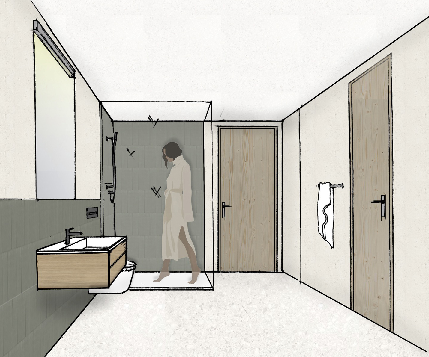 Das neue Bad besticht durch grossformatige Terrazzofliesen, elegante Wandverkleidungen und eine klare Raumaufteilung. Die Kombination aus Tageslicht, hochwertigen Oberflächen und moderner Ausstattung sorgt für ein komfortables und stilvolles Ambiente.