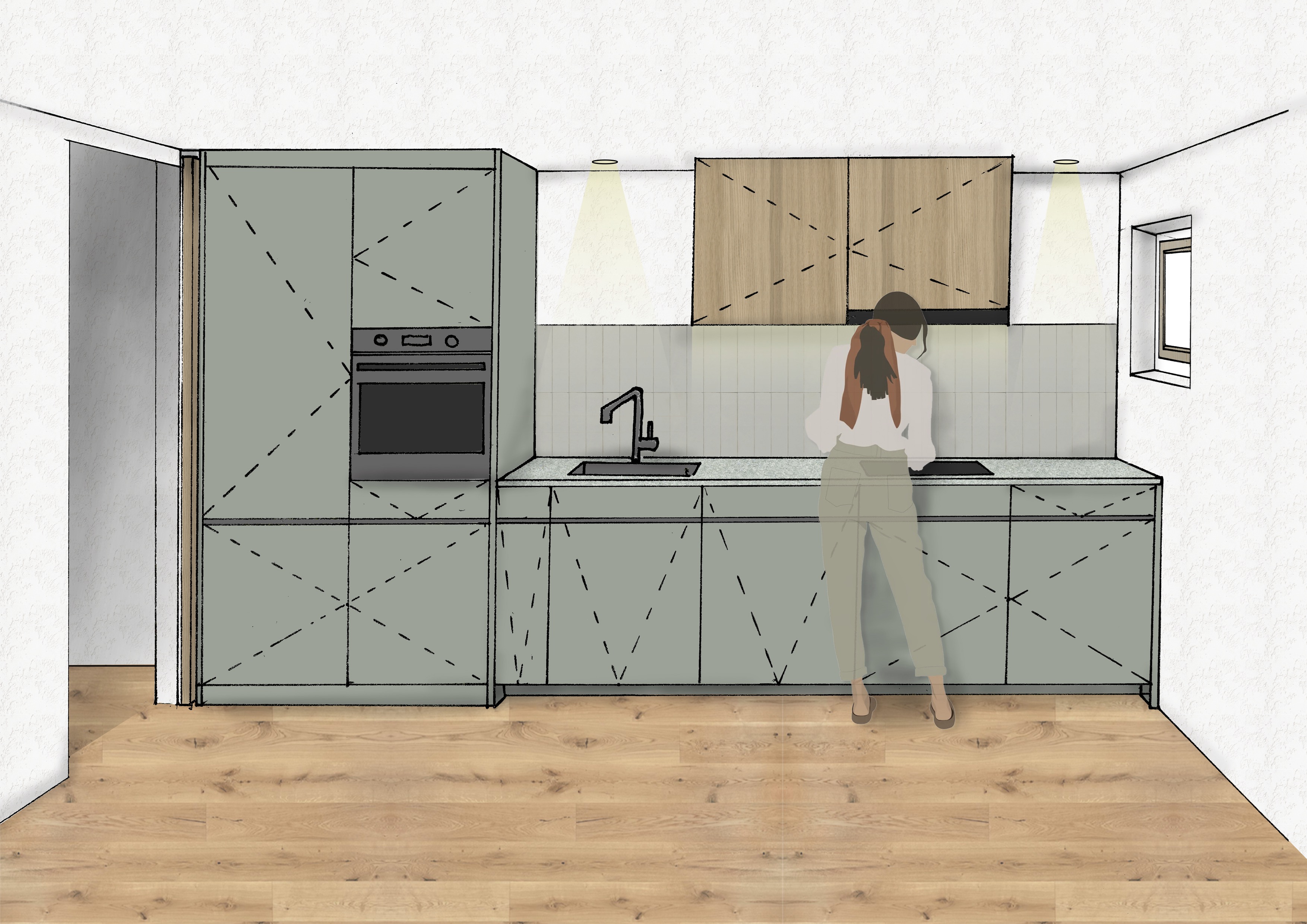 Die neue Küche überzeugt durch helle, natürliche Materialien und eine moderne Linienführung. Eichendielen, eine Arbeitsplatte aus Andeerer Granit und schilfgrüne Fronten schaffen eine freundliche und hochwertige Atmosphäre. Die grosszügige Gestaltung bietet durchdachte Stauraumlösungen und einen direkten Zugang zum Garten.