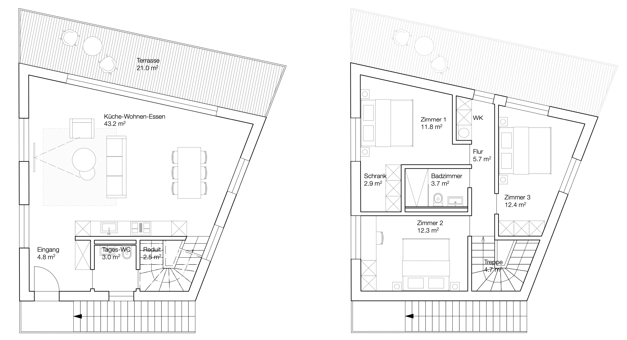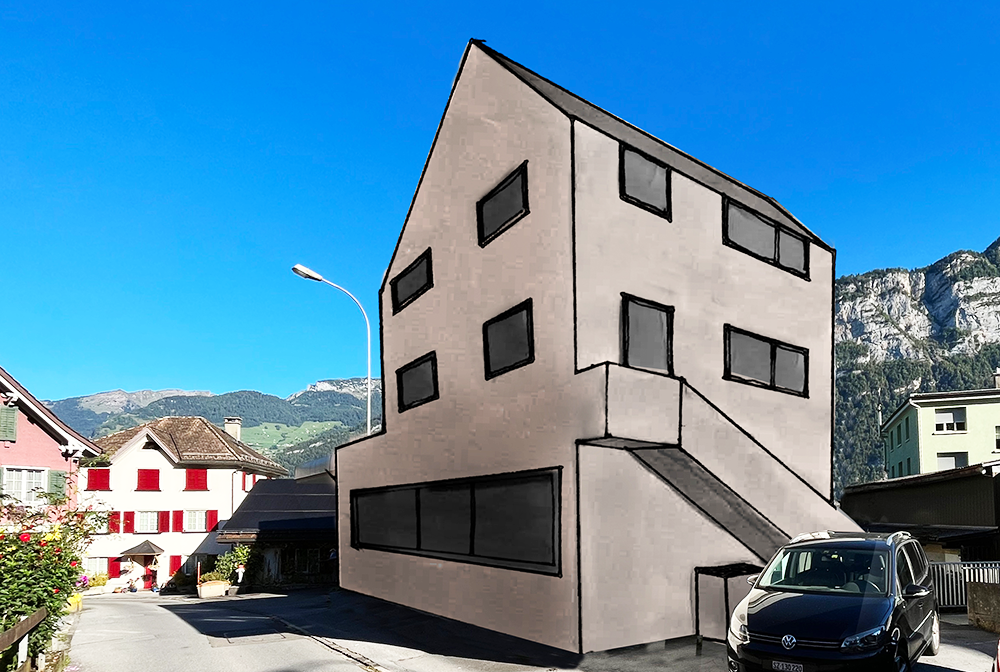 Auf einem Grundstück in Mühlehorn entsteht ein Projekt für eine neue Wohnung. Diese entwickelt sich auf einem bestehenden Sockelgeschoss und vervollständigt das Strassenbild in eine ortstypischen Gebäudevolumen.