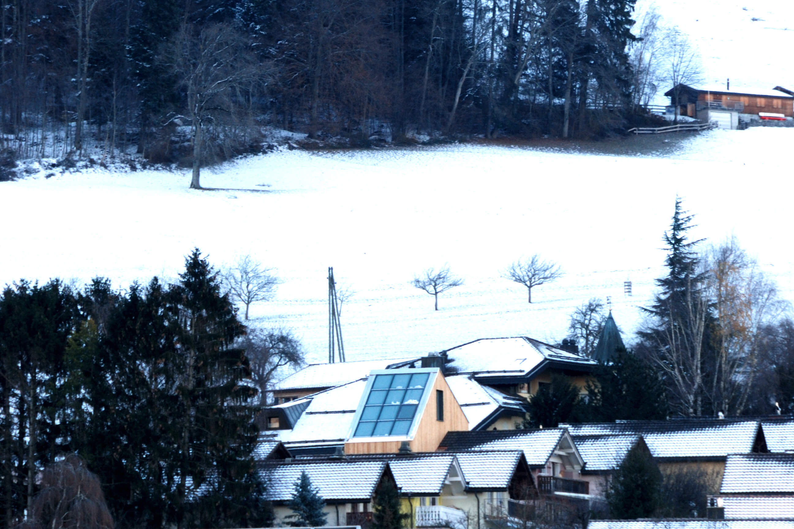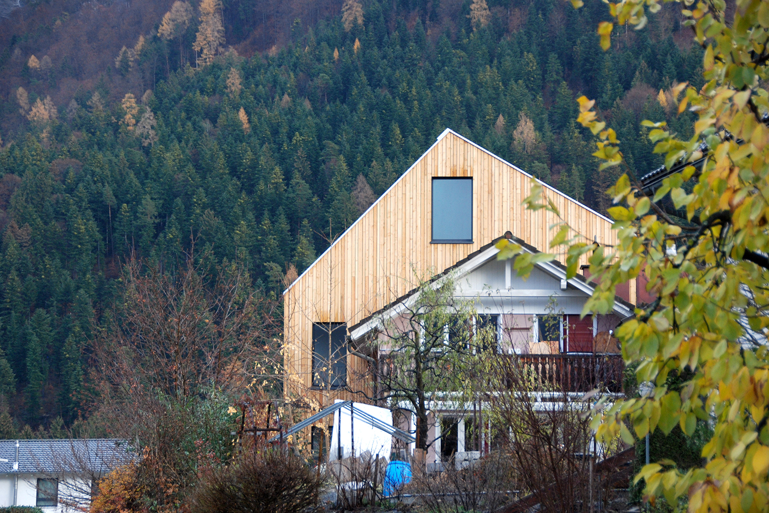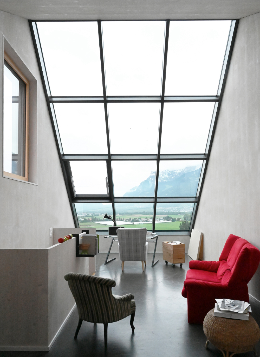 Der Erweiterungsbau wird als kompletter Holzelementbau in das bestehende Gebäude integriert. Das Einfamilienhaus wird im Dachgeschoss um einen zusätzlichen, überhohen Raum erweitert. Die gesamte Dachfläche ist hier gegen Norden hin verglast und bietet einen überwältigenden Ausblick auf das Churer Rheinthal. Zudem garantiert das konstante Nordlicht die idealen Bedingungen zur Nutzung des Raumes als Kunstatelier.