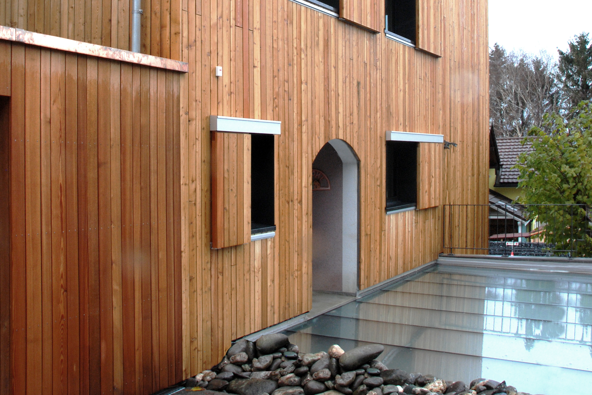Im Erdgeschoss befindet sich neu eine 2.5 Zimmer Wohnung mit separatem Eingang. Es wurde grossen Wert auf die Eigenständigkeit der Eingänge gelegt. So befindet sich der Eingang zur 2.5 Zimmer Wohnung auf der westlichen Hausseite, während das Einfamilienhaus von der Strasse her erschlossen ist.