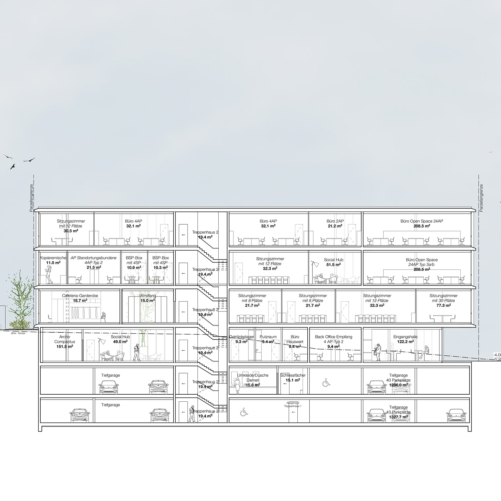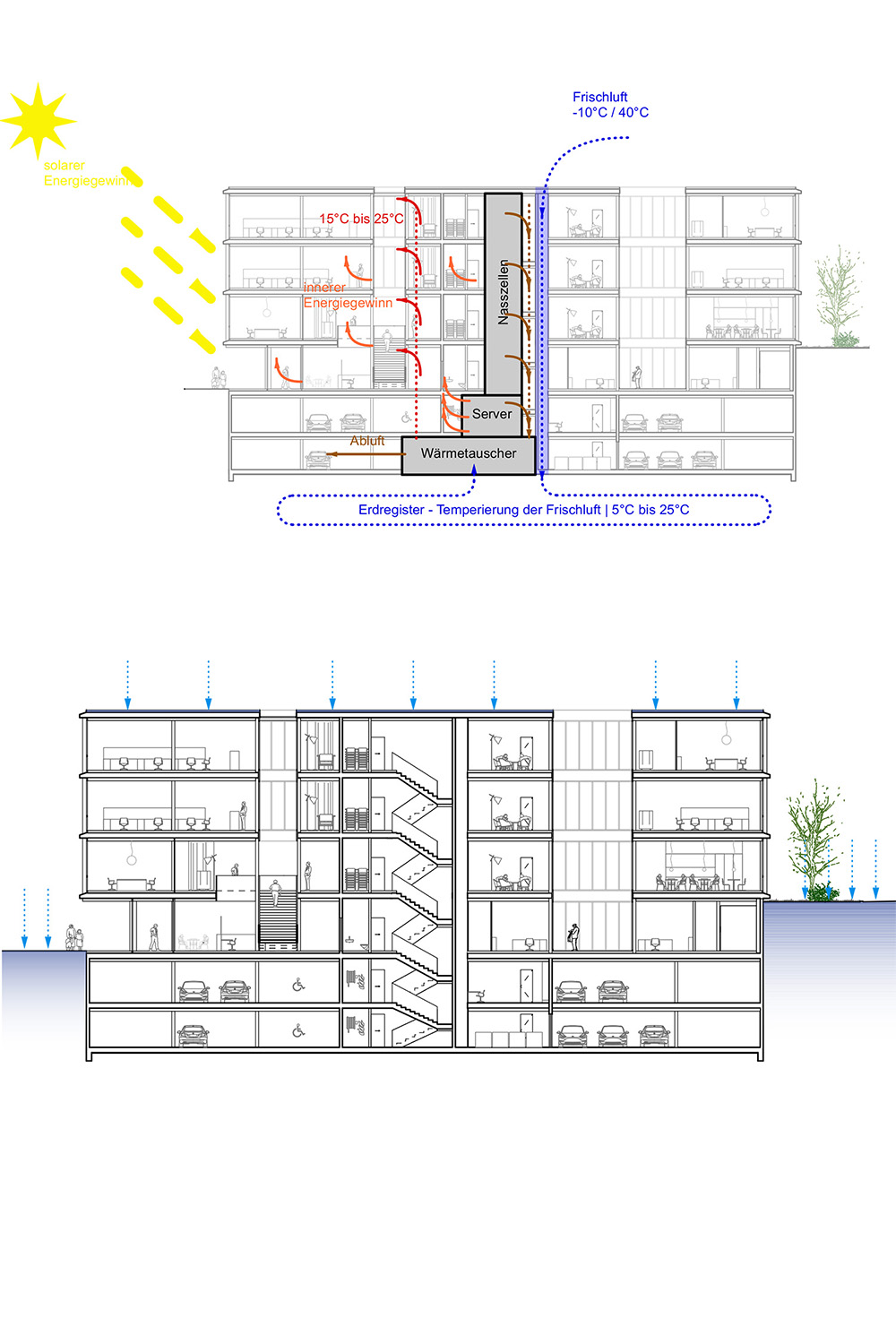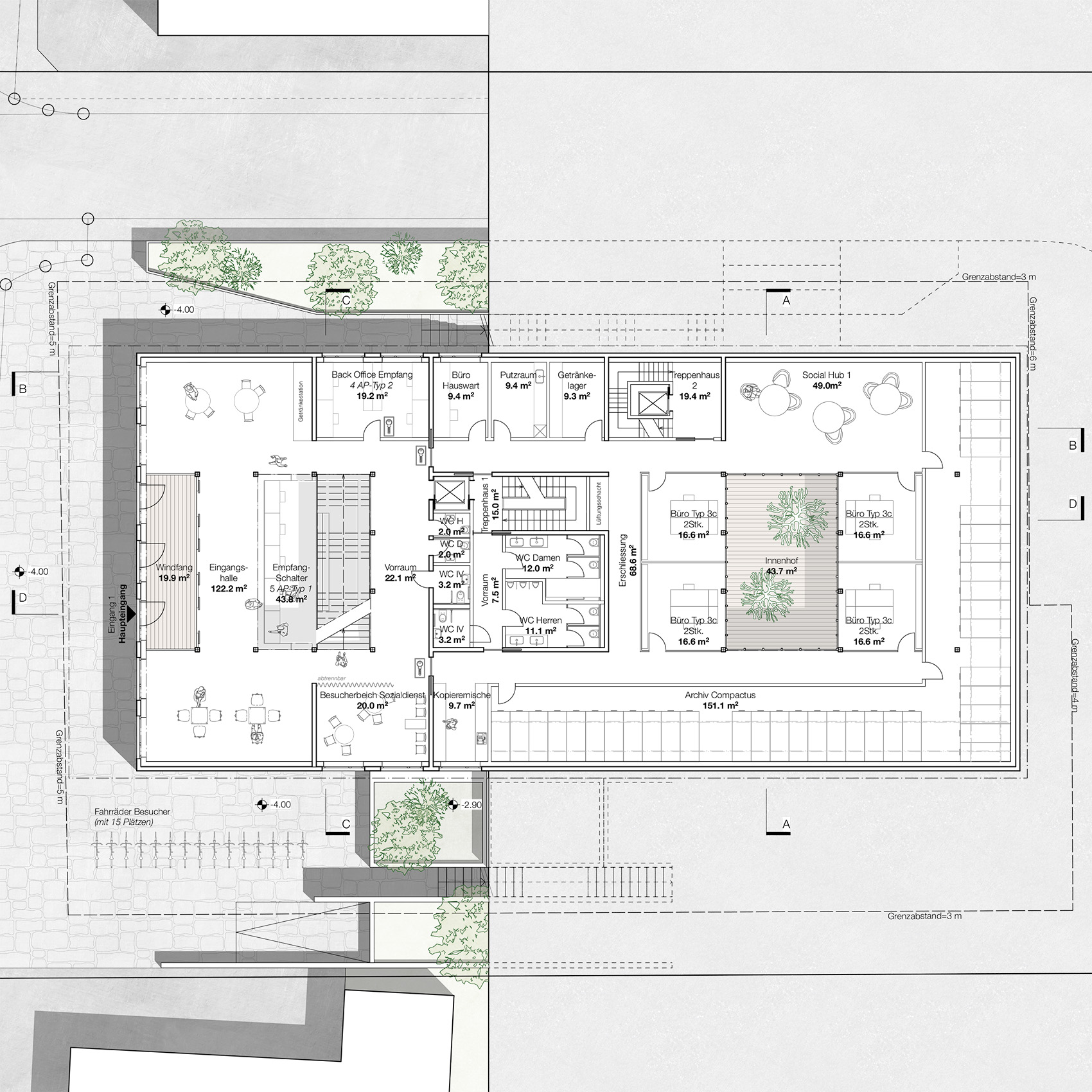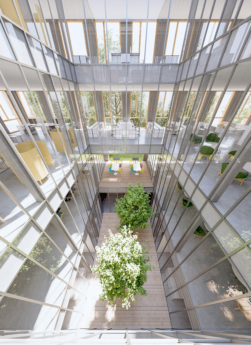 Das Gebäude verfügt über zwei unterschiedliche Lichthöfe. Der Lichthof im westlichen Bereich nähe Bahnhof ist geschlossen und zeigt sich als Atrium, um welches herum sich die sozialen Begegnungszonen entwickeln.