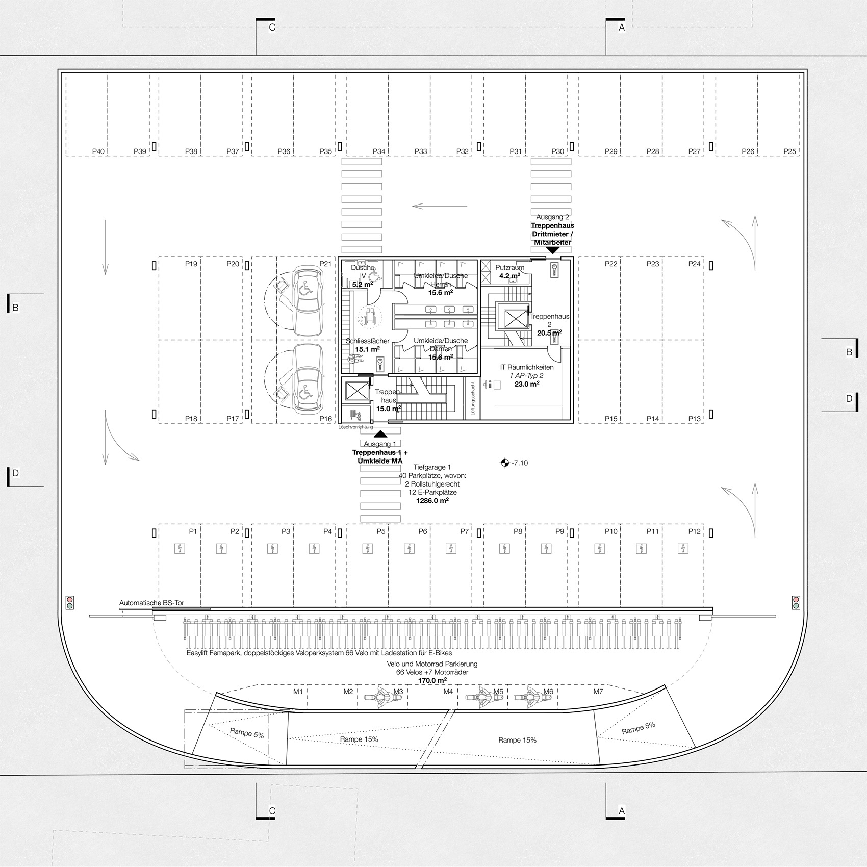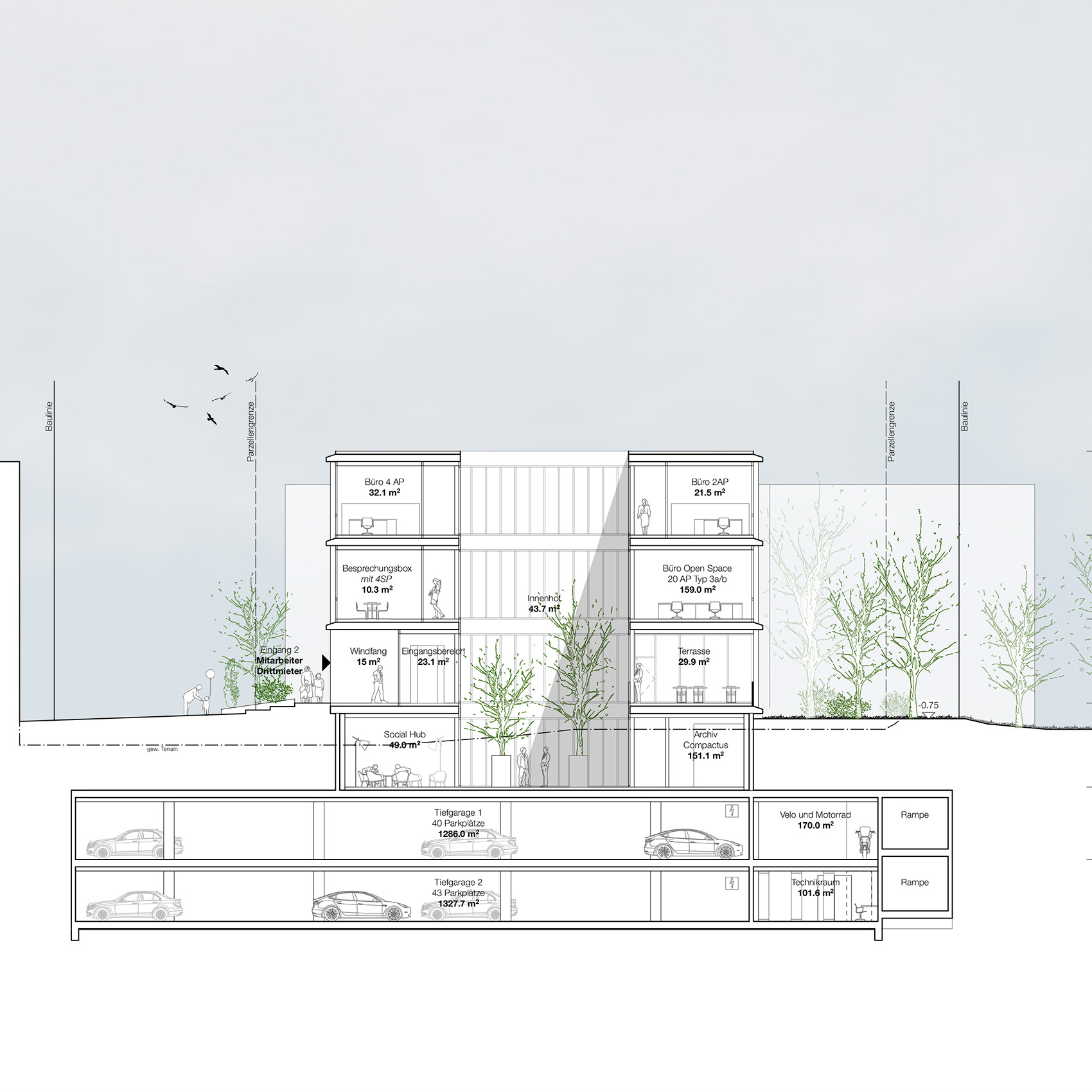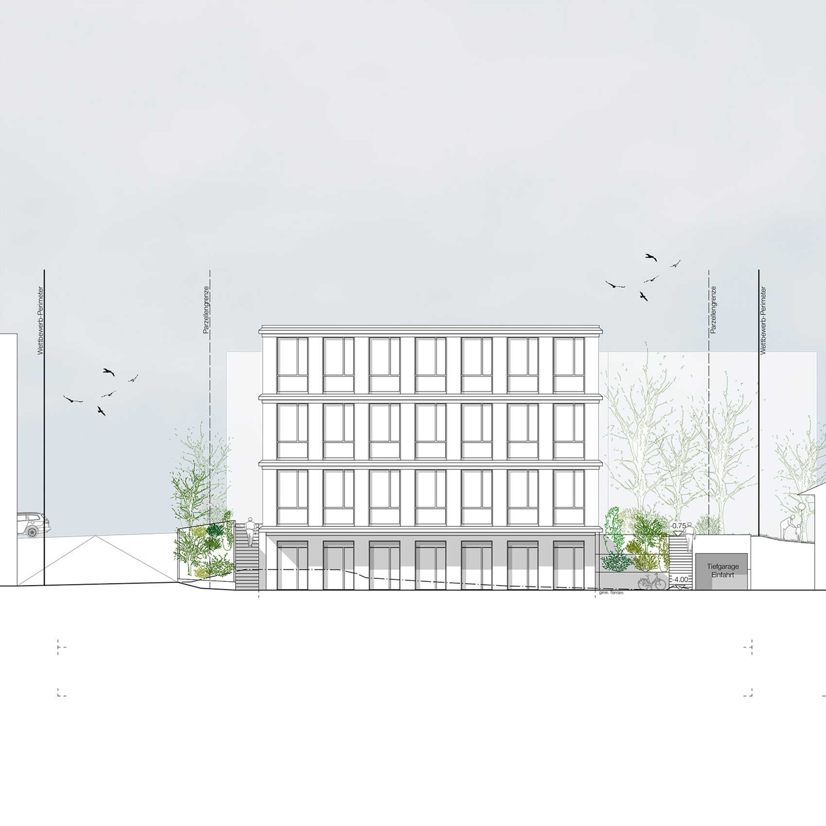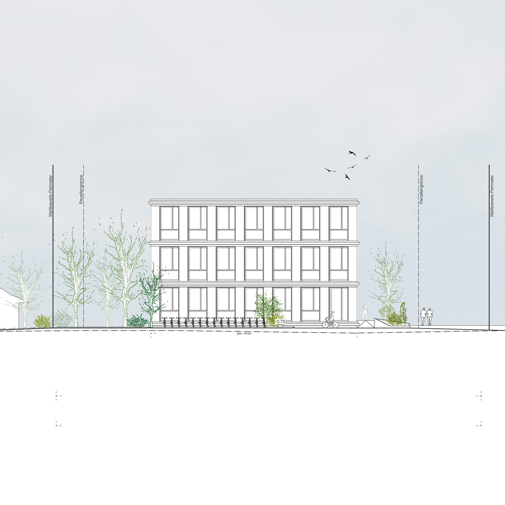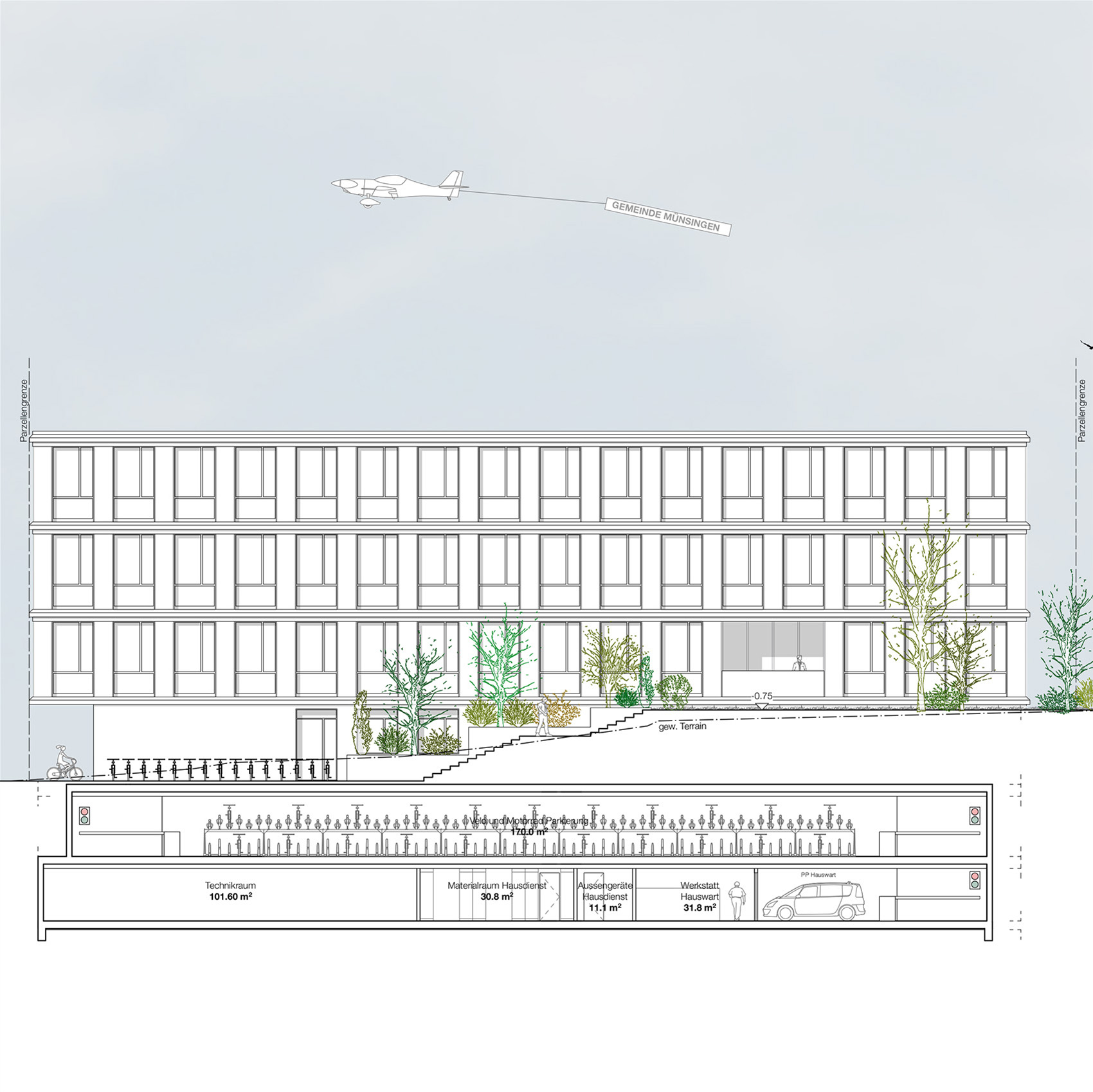 Das Gebäudevolumen entsteht durch die bestehenden Gebäudefluchten, aus der gewachsenen Struktur heraus. Gegen den Bahnhof, den öffentlichsten Bereich der Umgebung, zeigt das Gemeindehaus seinen urbanen Charakter und führt den Strassenraum von Norden her zum überdachten Vorplatz des Haupteingangs. Der Chutzenplatz wird neu zum Eingangsbereich der Mitarbeiter und Drittmieter mit einem separaten Eingang, erreichbar sowohl vom Bahnhof als auch in kürzerer Distanz vom Dorfzentrum.