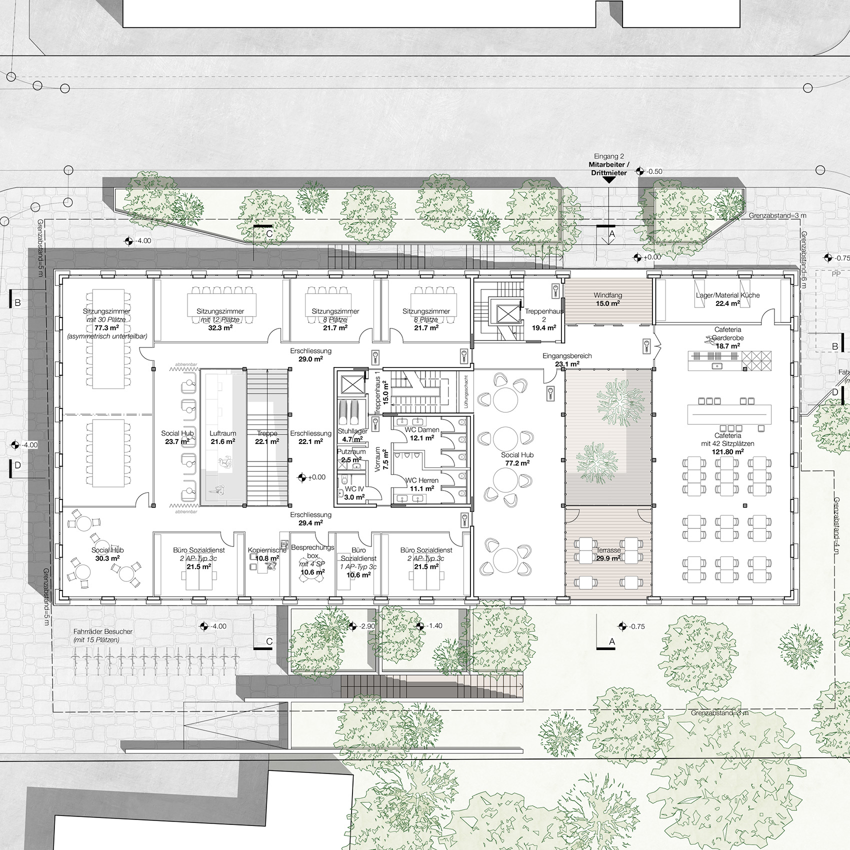 Der östliche Innenhof ist offen und lässt den Grünraum wortwörtlich ins Herz des Gemeindezentrums eindringen und bietet den Mitarbeitern einen sicht-, schall- und sonnengeschützten Aussenbereich.